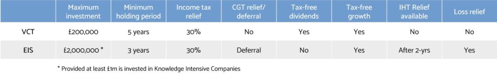 With both VCT’s and EIS, investors could get up to 30% income tax relief and tax-free growth. Moreover, VCTs offer tax-free dividends whilst EIS offer potential inheritance tax and capital gains tax reliefs